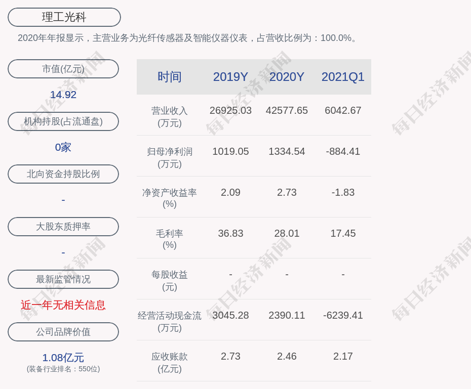 2020年年报显示,理工光科的主营业务为光纤传感器及智能仪器仪表,占营收比例为:100.0%。