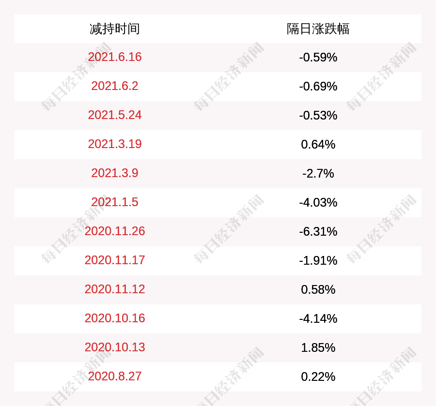 2. 蠡湖股份上次发布减持公告是2021年06月16日,第二个交易日下跌0.59%,蠡湖股份近一年共发布13次减持类公告。更多关键信息,请搜索“道达号”。
