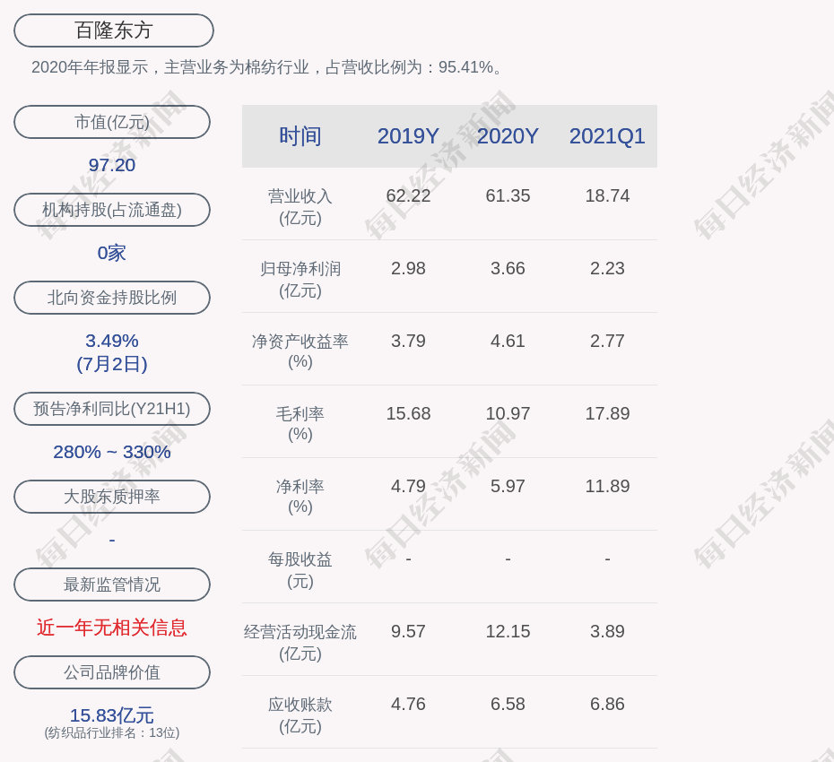 2020年年报显示,百隆东方的主营业务为棉纺行业,占营收比例为:95.41%。