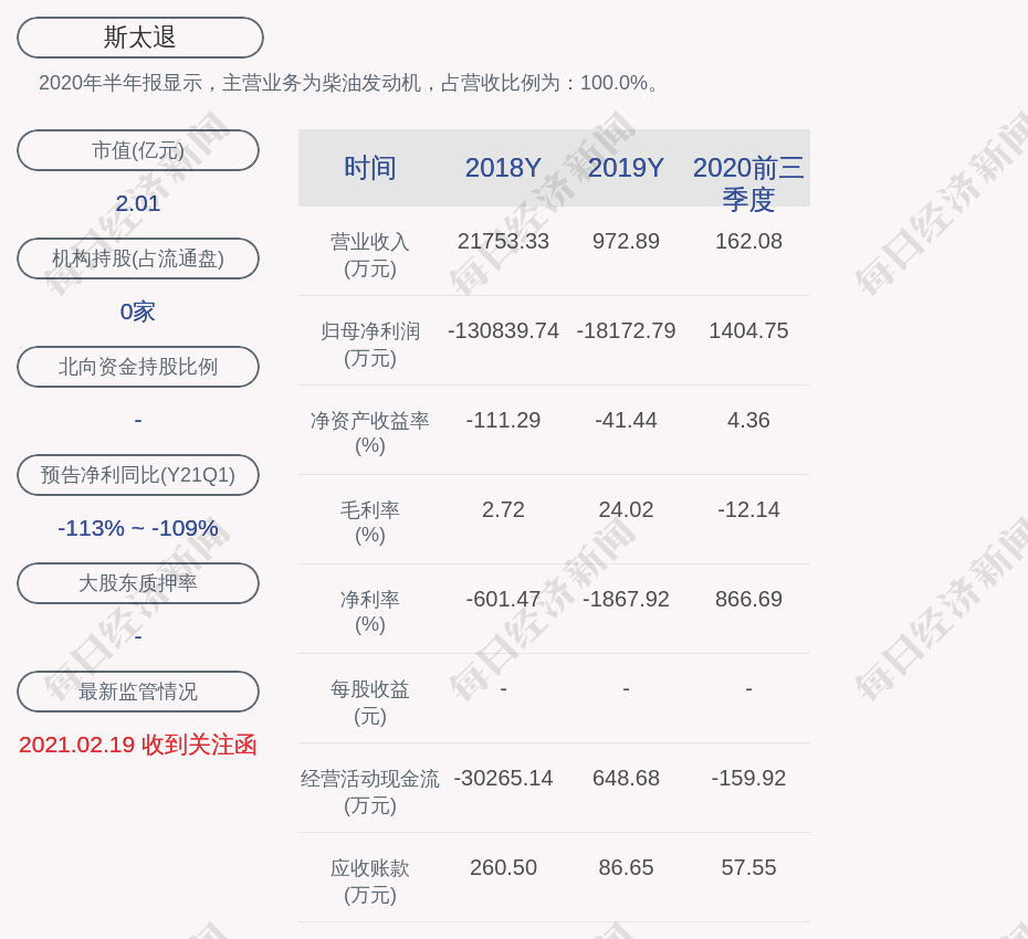 2020年半年报显示,斯太退的主营业务为柴油发动机,占营收比例为:100.0%。