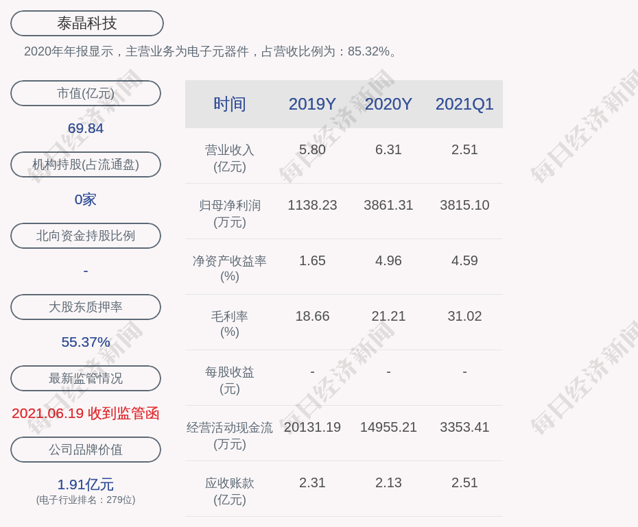2020年年报显示,泰晶科技的主营业务为电子元器件,占营收比例为:85.32%。