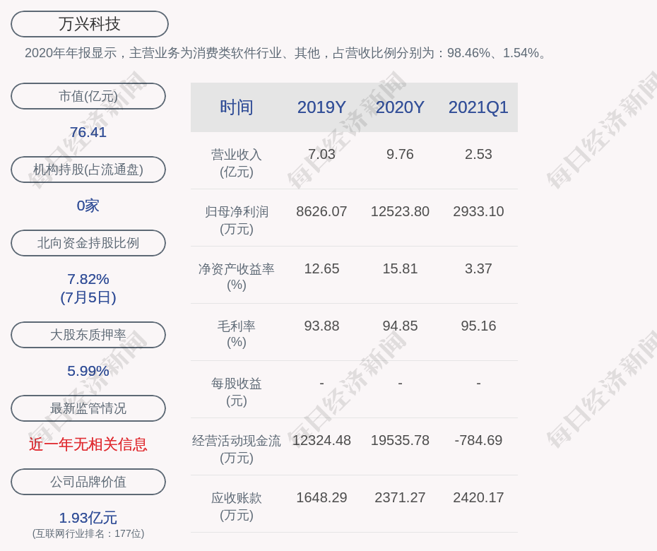 2020年年报显示,万兴科技的主营业务为消费类软件行业、其他,占营收比例分别为:98.46%、1.54%。