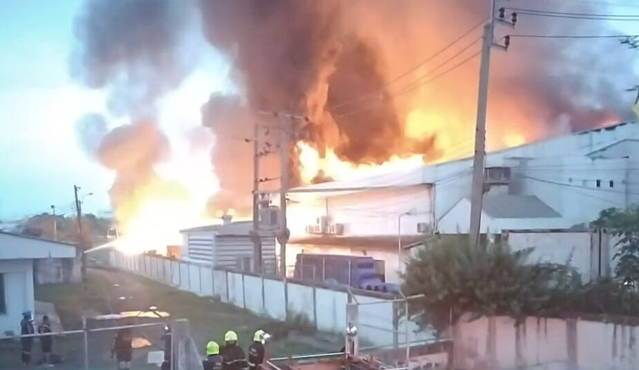 每经AI快讯,当地时间7月6日18时30分,位于泰国首都曼谷腊格拉邦工业园区内的一座日化工厂仓库发生火灾。现场火光冲天、浓烟滚滚,并不时发出爆炸声,消防人员正在奋力灭火。
