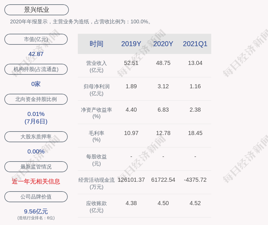 2020年年报显示,景兴纸业的主营业务为造纸,占营收比例为:100.0%。