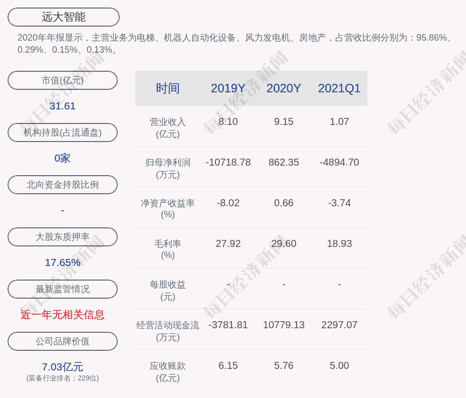2020年年报显示,远大智能的主营业务为电梯、机器人自动化设备、风力发电机、房地产,占营收比例分别为:95.86%、0.29%、0.15%、0.13%。