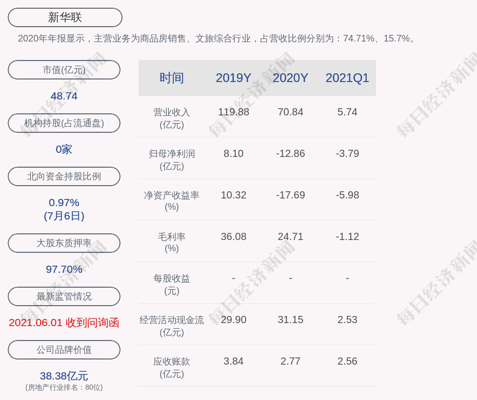 2020年年报显示,新华联的主营业务为商品房销售、文旅综合行业,占营收比例分别为:74.71%、15.7%。