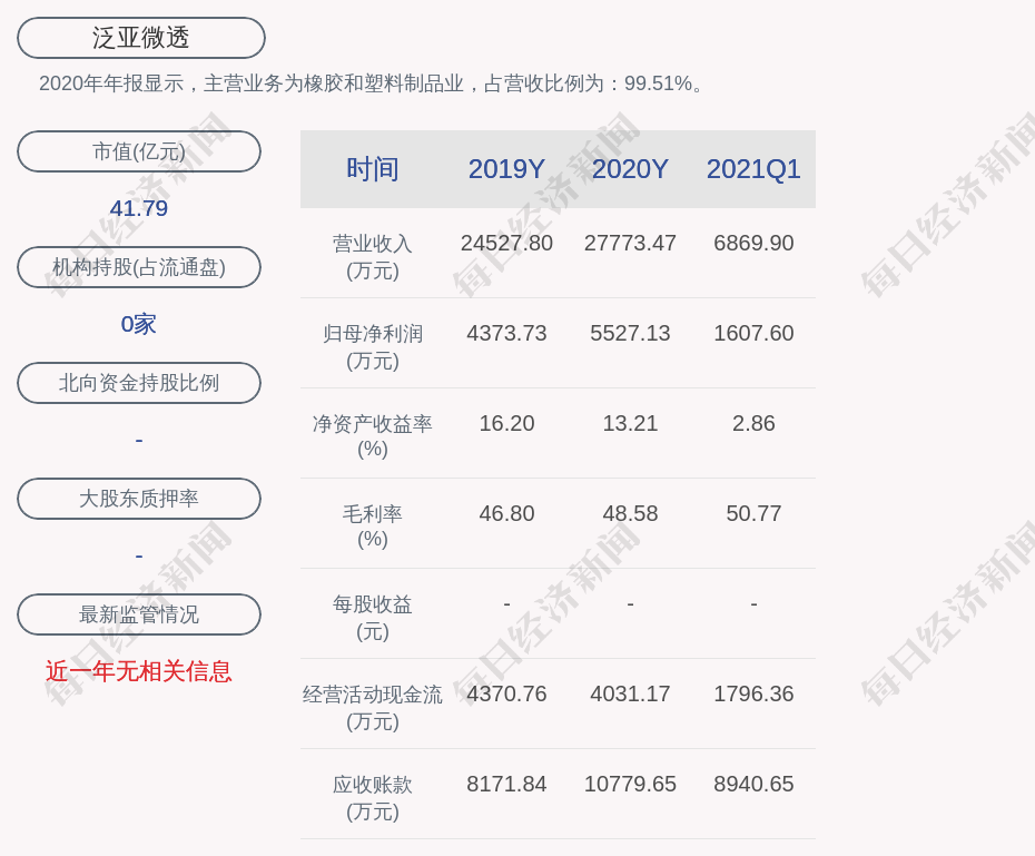 2020年年报显示,泛亚微透的主营业务为橡胶和塑料制品业,占营收比例为:99.51%。