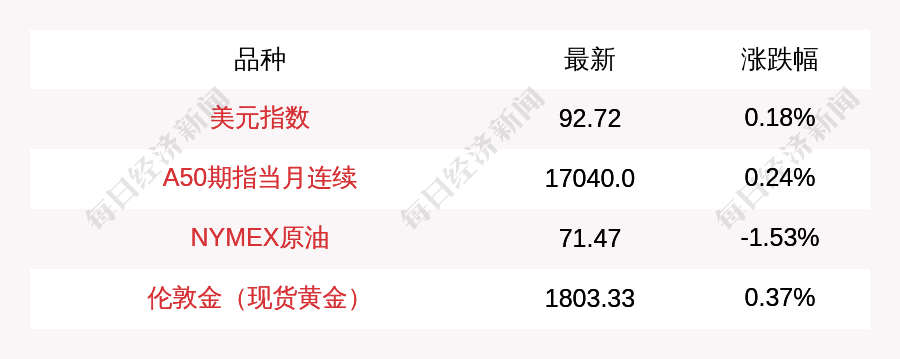 每经AI快讯:北京时间7月8日05:00,富时中国A50指数期货上涨41.0点,涨幅为0.24%,报17040.0点;NYMEX原油收盘下跌1.11点,跌幅为1.53%,报71.47点;美元指数收盘上涨0.17点,涨幅为0.18%,报92.72点;伦敦金(现货黄金)收盘上涨6.56点,涨幅为0.37%,报1803.33点。