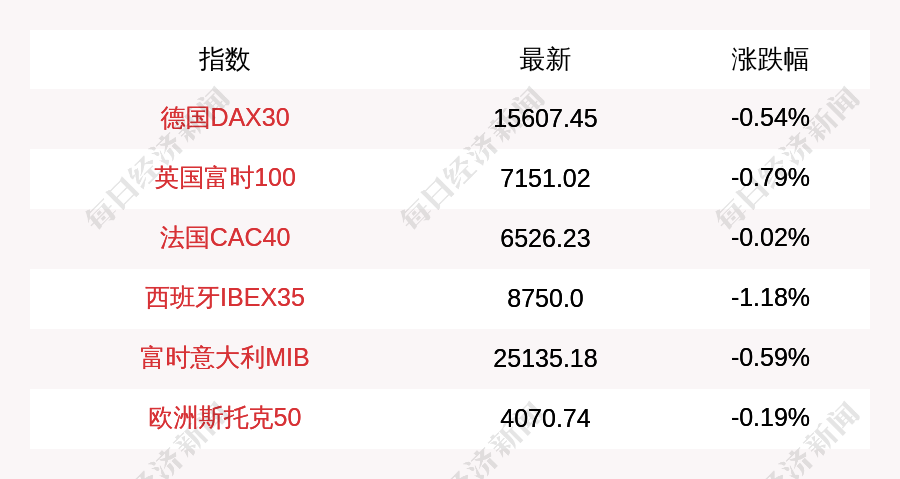 每经AI快讯:北京时间7月8日15:00,德国DAX30指数开盘下跌85.26点,跌幅为0.54%,报15607.45点;英国富时100指数开盘下跌56.68点,跌幅为0.79%,报7094.34点;法国CAC40指数开盘下跌1.49点,跌幅为0.02%,报6526.23点;西班牙IBEX35指数开盘下跌104.5点,跌幅为1.18%,报8750.0点;富时意大利MIB指数开盘下跌149.81点,跌幅为0.59%,报25135.18点;欧洲斯托克50指数开盘下跌7.79点,跌幅为0.19%,报4070.74点。