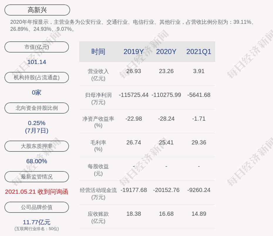 2020年年报显示,高新兴的主营业务为公安行业、交通行业、电信行业、其他行业,占营收比例分别为:39.11%、26.89%、24.93%、9.07%。