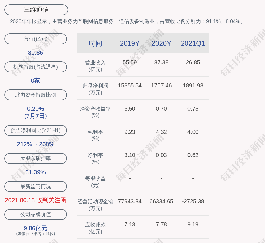 2020年年报显示,三维通信的主营业务为互联网信息服务、通信设备制造业,占营收比例分别为:91.1%、8.04%。