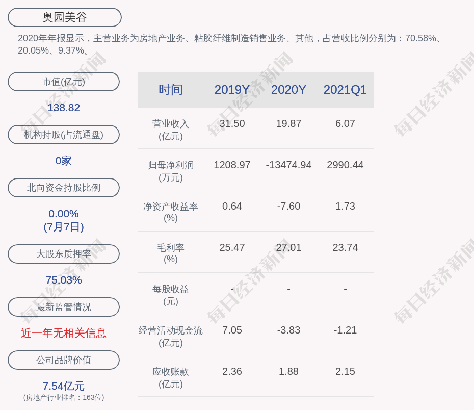 2020年年报显示,奥园美谷的主营业务为房地产业务、粘胶纤维制造销售业务、其他,占营收比例分别为:70.58%、20.05%、9.37%。