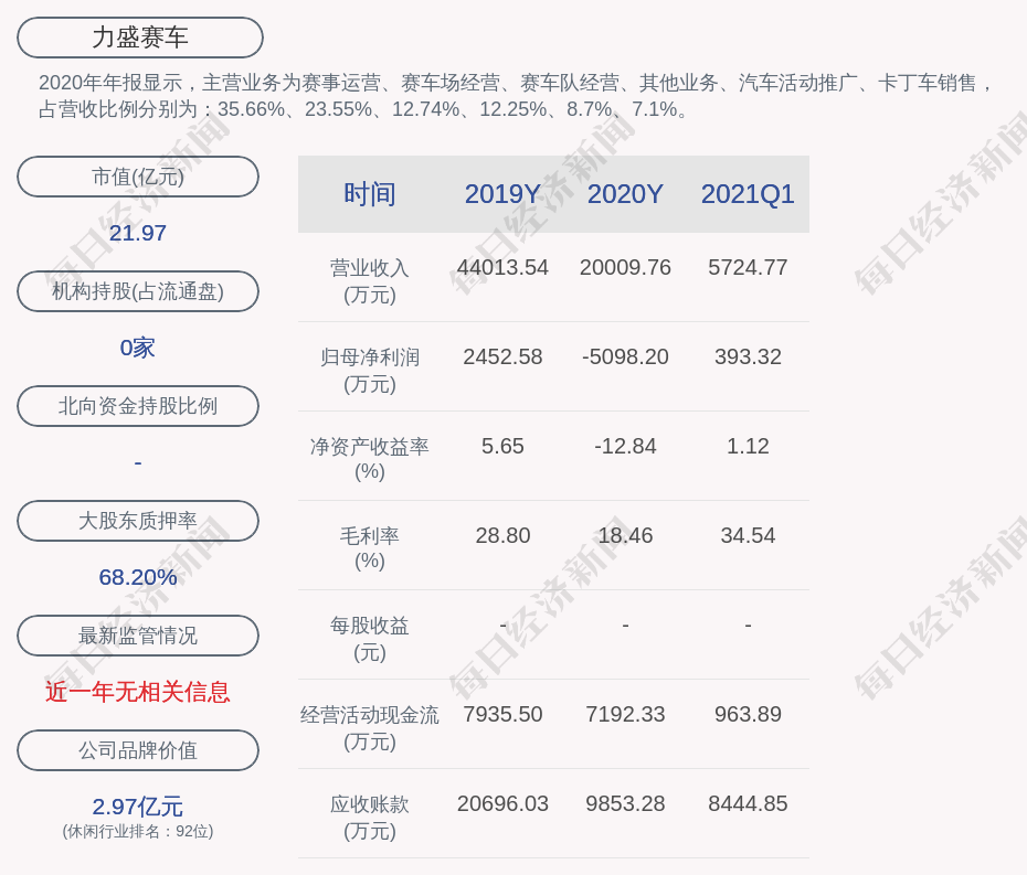 2020年年报显示,力盛赛车的主营业务为赛事运营、赛车场经营、赛车队经营、其他业务、汽车活动推广、卡丁车销售,占营收比例分别为:35.66%、23.55%、12.74%、12.25%、8.7%、7.1%。