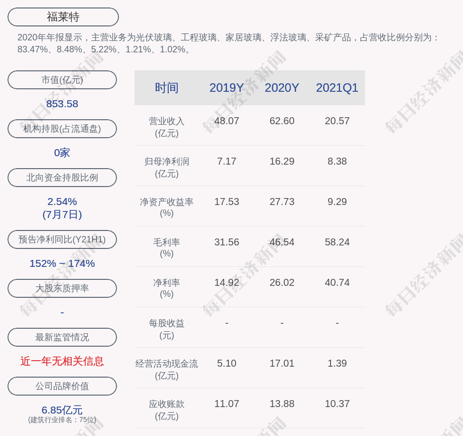 2020年年报显示,福莱特的主营业务为光伏玻璃、工程玻璃、家居玻璃、浮法玻璃、采矿产品。
