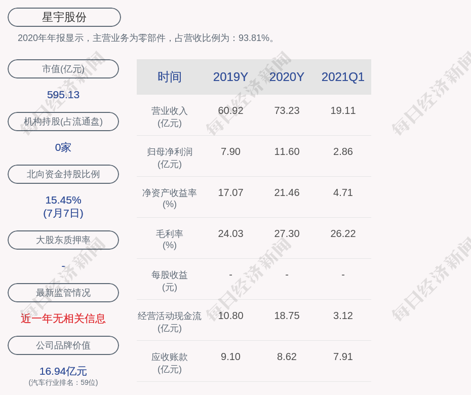 2020年年报显示,星宇股份的主营业务为零部件,占营收比例为:93.81%。