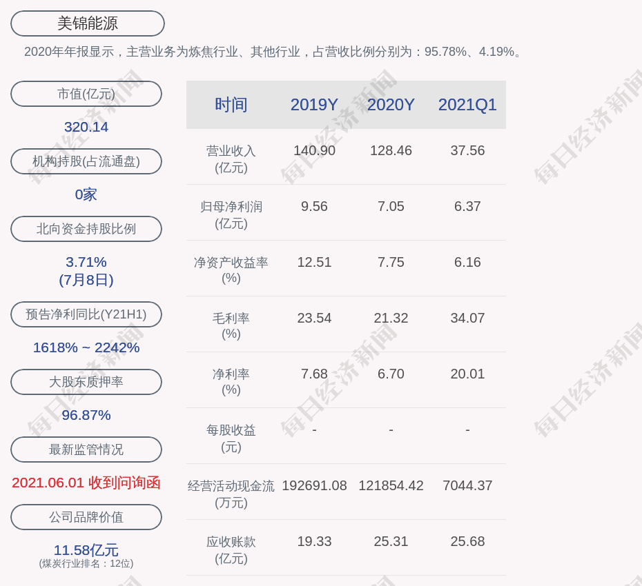 2020年年报显示,美锦能源的主营业务为炼焦行业、其他行业,占营收比例分别为:95.78%、4.19%。