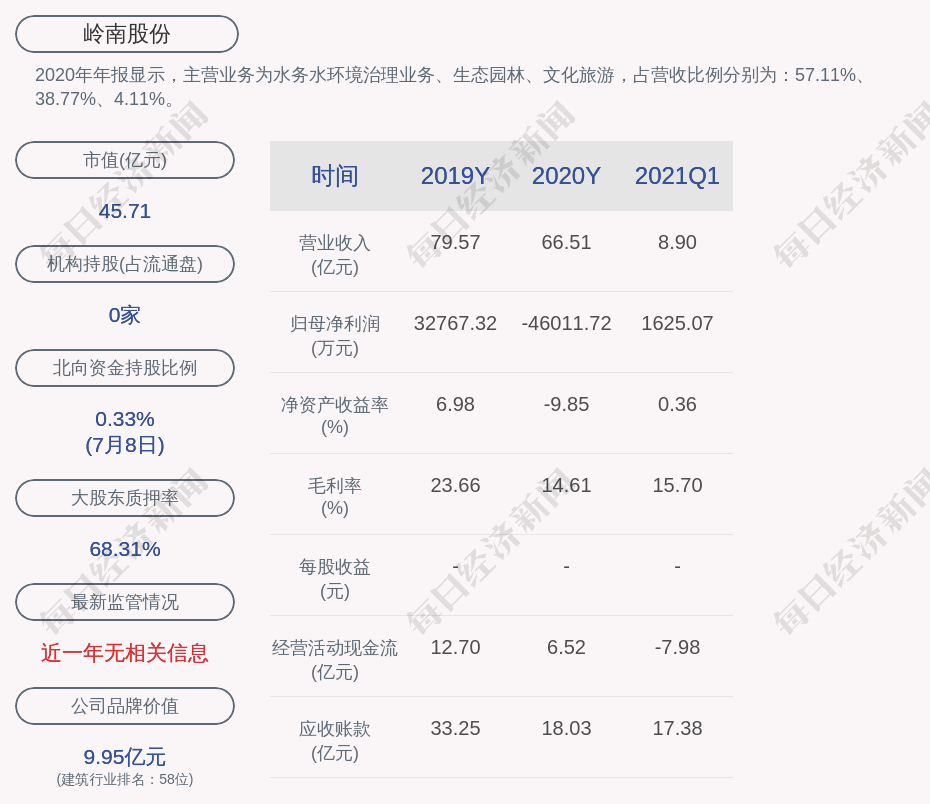2020年年报显示,岭南股份的主营业务为水务水环境治理业务、生态园林、文化旅游,占营收比例分别为:57.11%、38.77%、4.11%。