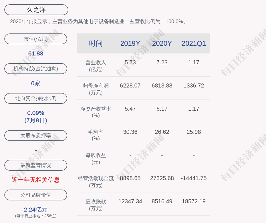 2020年年报显示,久之洋的主营业务为其他电子设备制造业,占营收比例为:100.0%。
