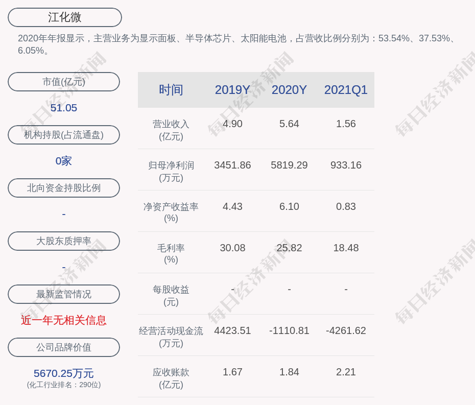 2020年年报显示,江化微的主营业务为显示面板、半导体芯片、太阳能电池,占营收比例分别为:53.54%、37.53%、6.05%。