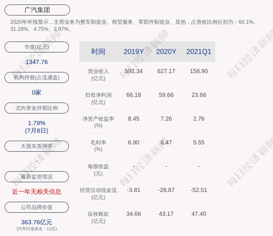 2020年年报显示,广汽集团的主营业务为整车制造业、商贸服务、零部件制造业、其他,占营收比例分别为:60.1%、31.18%、4.75%、3.97%。