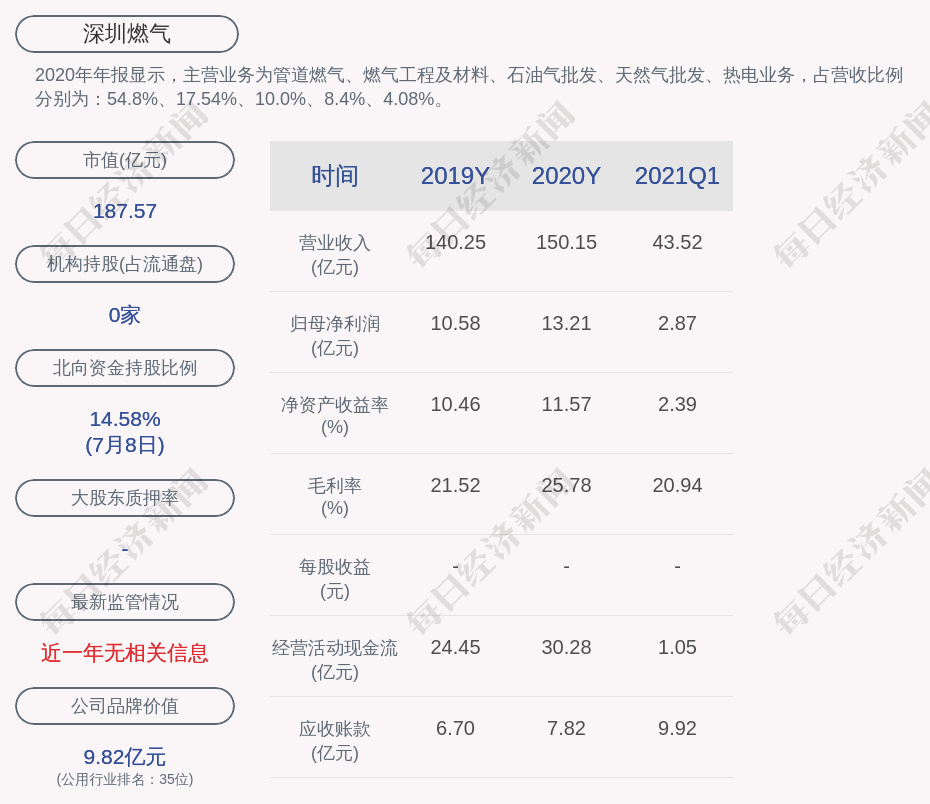 2020年年报显示,深圳燃气的主营业务为管道燃气、燃气工程及材料、石油气批发、天然气批发、热电业务,占营收比例分别为:54.8%、17.54%、10.0%、8.4%、4.08%。