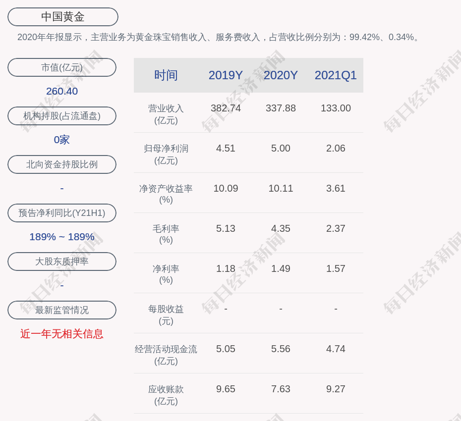 2020年年报显示,中国黄金的主营业务为黄金珠宝销售收入、服务费收入,占营收比例分别为:99.42%、0.34%。