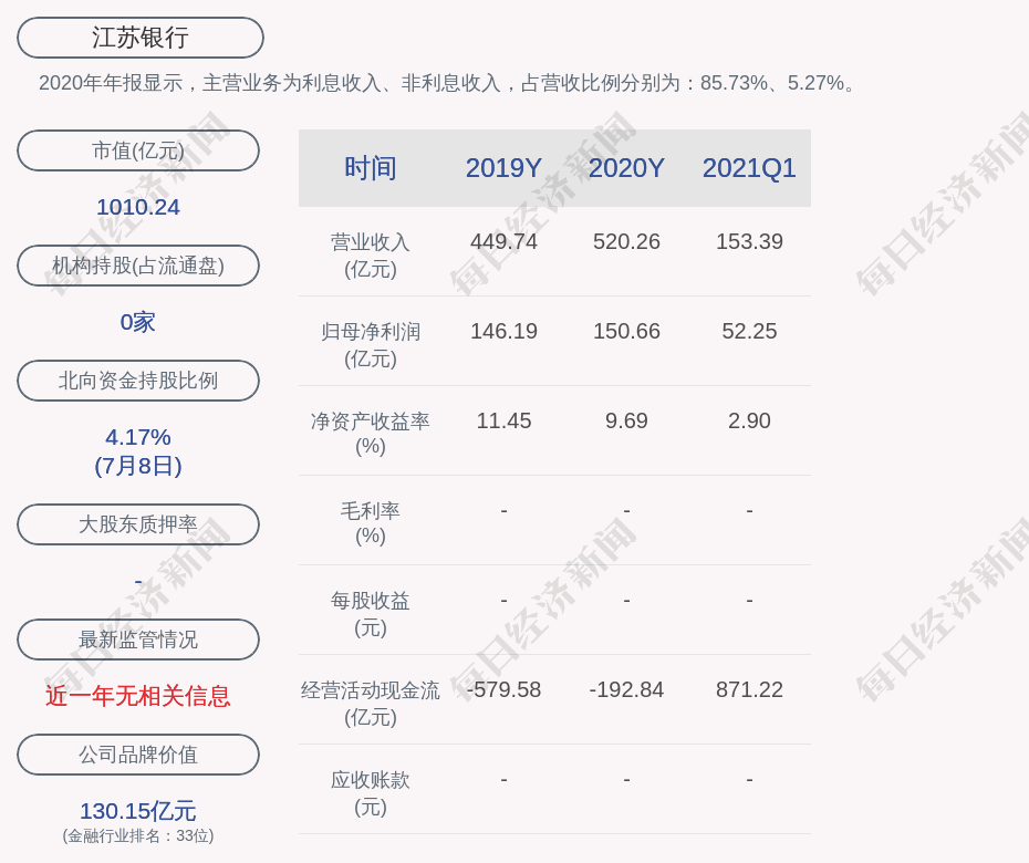 2020年年报显示,江苏银行的主营业务为利息收入、非利息收入,占营收比例分别为:85.73%、5.27%。