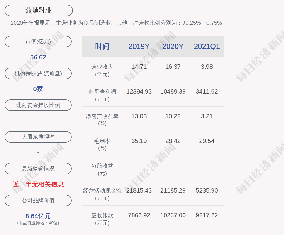 2020年年报显示,燕塘乳业的主营业务为食品制造业等。