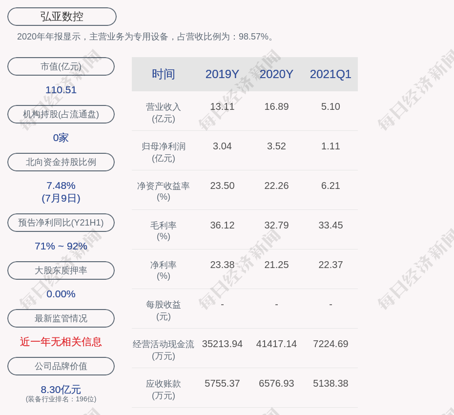 2020年年报显示,弘亚数控的主营业务为专用设备,占营收比例为:98.57%。