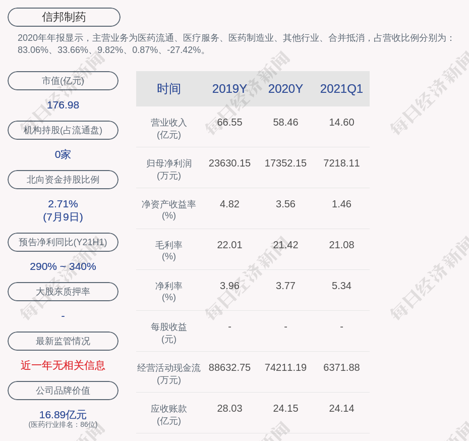 2020年年报显示,信邦制药的主营业务为医药流通、医疗服务、医药制造业、其他行业、合并抵消,占营收比例分别为:83.06%、33.66%、9.82%、0.87%、-27.42%。