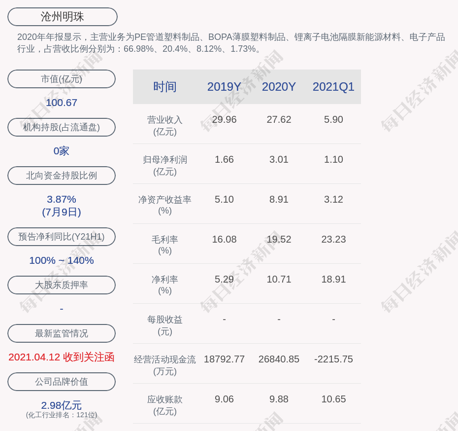 每经AI快讯,沧州明珠(SZ 002108,收盘价:7.1元)7月11日晚间发布公告称,沧州明珠塑料股份有限公司A股股票2021年07月07日、2021年07月08日及2021年07月09日连续三个交易日收盘价格涨幅偏离值累计超过20%。经核实,公司、控股股东和实际控制人不存在关于本公司的应披露而未披露的重大事项,也不存在其他处于筹划阶段的重大事项。