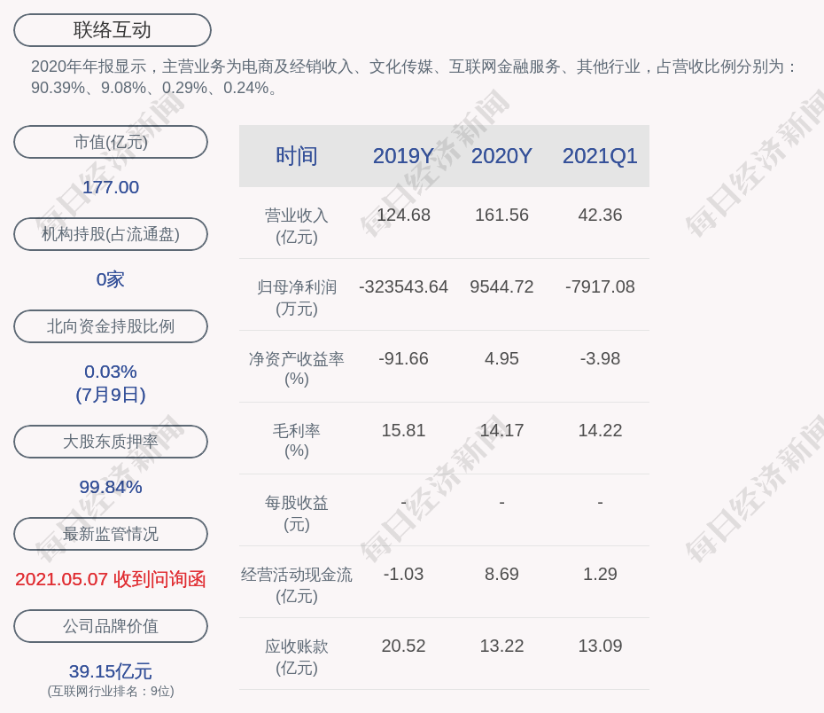 2020年年报显示,联络互动的主营业务为电商及经销收入、文化传媒、互联网金融服务、其他行业,占营收比例分别为:90.39%、9.08%、0.29%、0.24%。