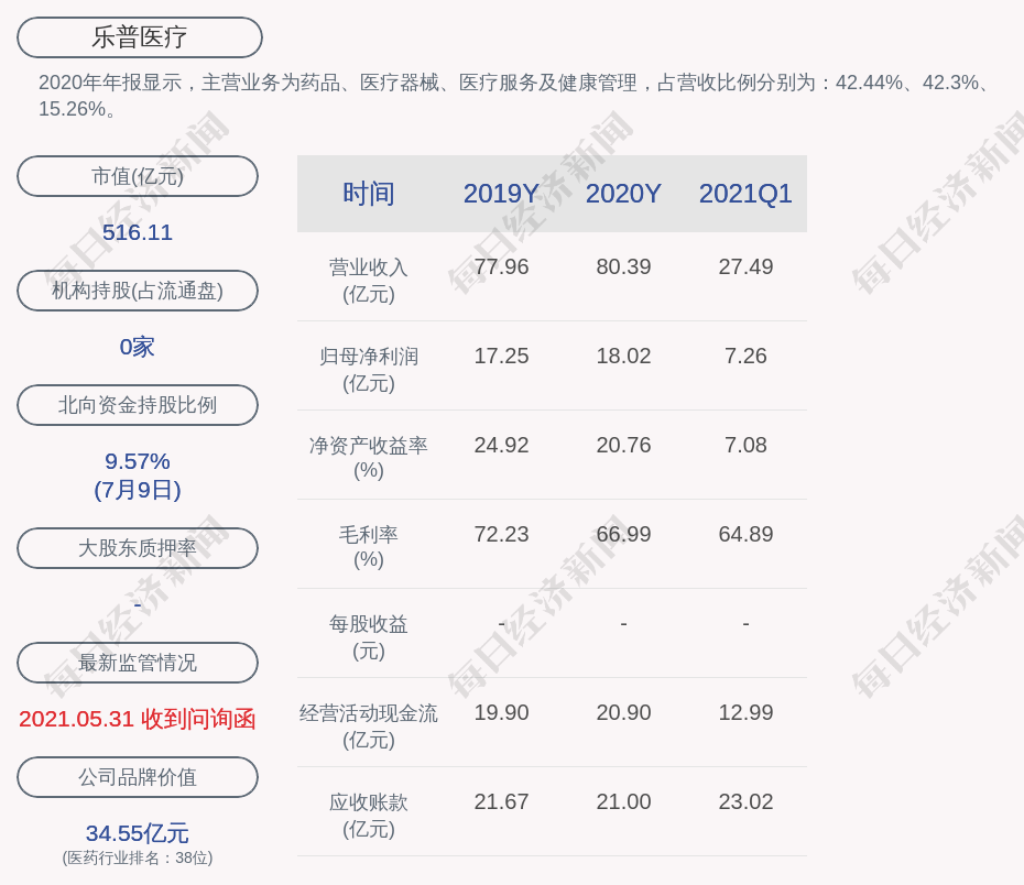 2020年年报显示,乐普医疗的主营业务为药品、医疗器械、医疗服务及健康管理,占营收比例分别为:42.44%、42.3%、15.26%。