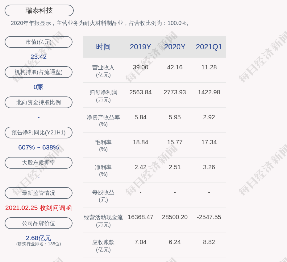 2020年年报显示,瑞泰科技的主营业务为耐火材料制品业。