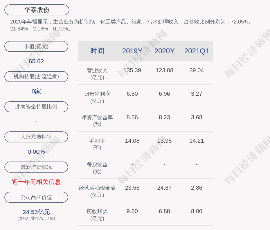 2020年年报显示,华泰股份的主营业务为机制纸、化工类产品、纸浆、污水处理收入,占营收比例分别为:72.05%、21.84%、2.16%、0.01%。