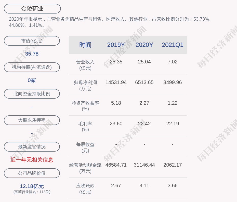 2020年年报显示,金陵药业的主营业务为药品生产与销售、医疗收入、其他行业。