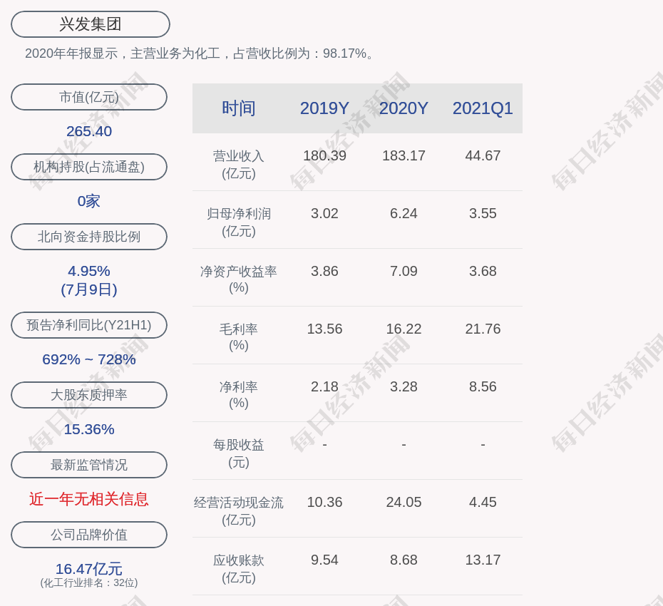 2020年年报显示,兴发集团的主营业务为化工,占营收比例为:98.17%。