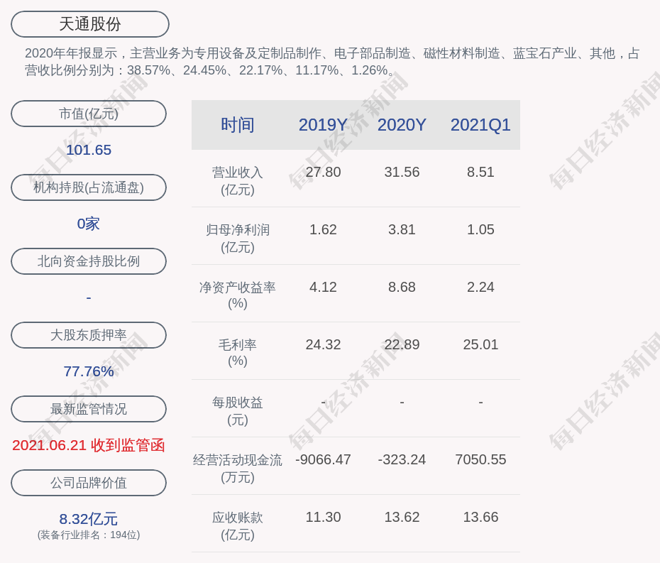 2020年年报显示,天通股份的主营业务为专用设备及定制品制作、电子部品制造、磁性材料制造、蓝宝石产业、其他,占营收比例分别为:38.57%、24.45%、22.17%、11.17%、1.26%。