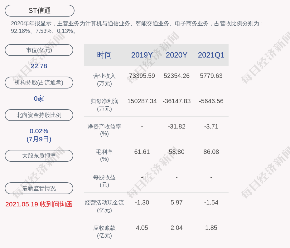 2020年年报显示,ST信通的主营业务为计算机与通信业务、智能交通业务、电子商务业务,占营收比例分别为:92.18%、7.53%、0.13%。