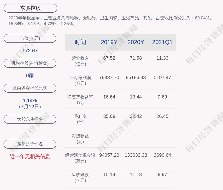 2020年年报显示,东鹏控股的主营业务为有釉砖、无釉砖、卫生陶瓷、卫浴产品、其他,占营收比例分别为:69.04%、15.64%、8.16%、4.72%、1.35%。