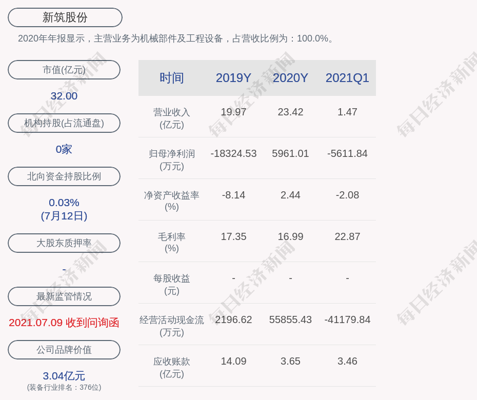 2020年年报显示,新筑股份的主营业务为机械部件及工程设备,占营收比例为:100.0%。