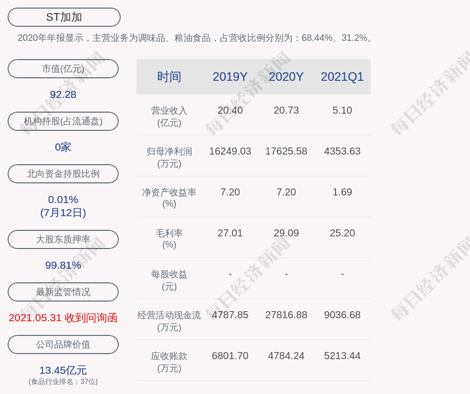 2020年年报显示,ST加加的主营业务为调味品、粮油食品,占营收比例分别为:68.44%、31.2%。