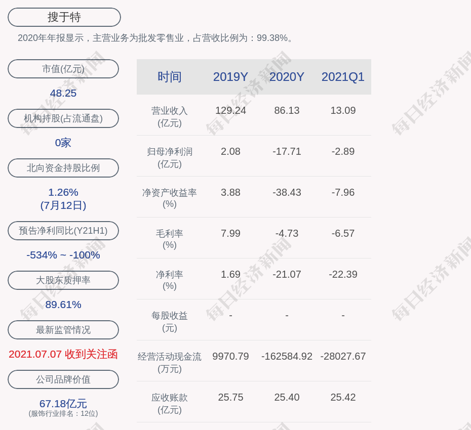2020年年报显示,搜于特的主营业务为批发零售业,占营收比例为:99.38%。
