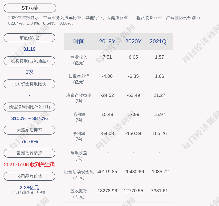 2020年年报显示,ST八菱的主营业务为汽车行业、其他行业、大健康行业、工程及装备行业,占营收比例分别为:82.84%、1.84%、0.54%、0.06%。