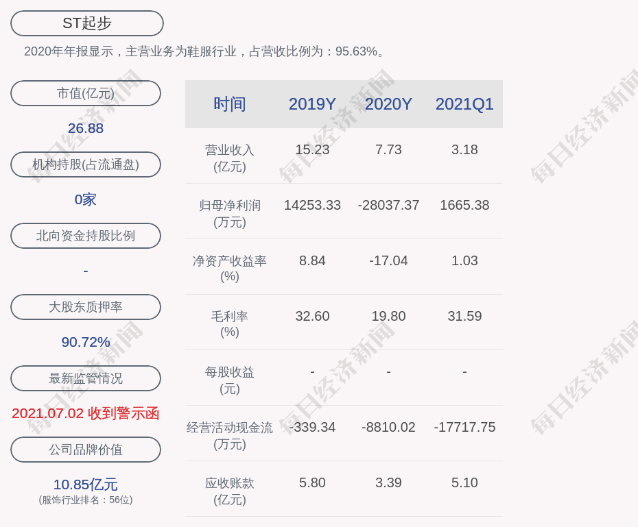 2020年年报显示,ST起步的主营业务为鞋服行业,占营收比例为:95.63%。