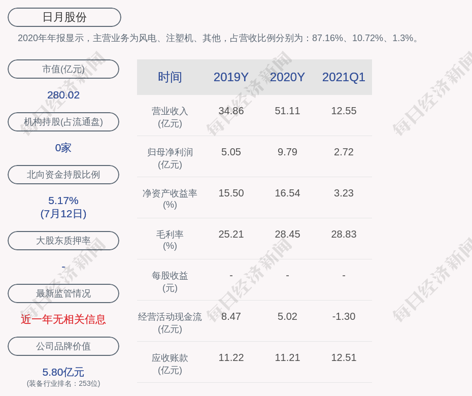 2020年年报显示,日月股份的主营业务为风电、注塑机、其他,占营收比例分别为:87.16%、10.72%、1.3%。