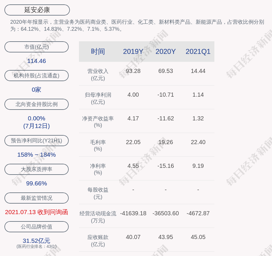 2020年年报显示,延安必康的主营业务为医药商业类、医药行业、化工类、新材料类产品、新能源产品,占营收比例分别为:64.12%、14.83%、7.22%、7.1%、5.37%。