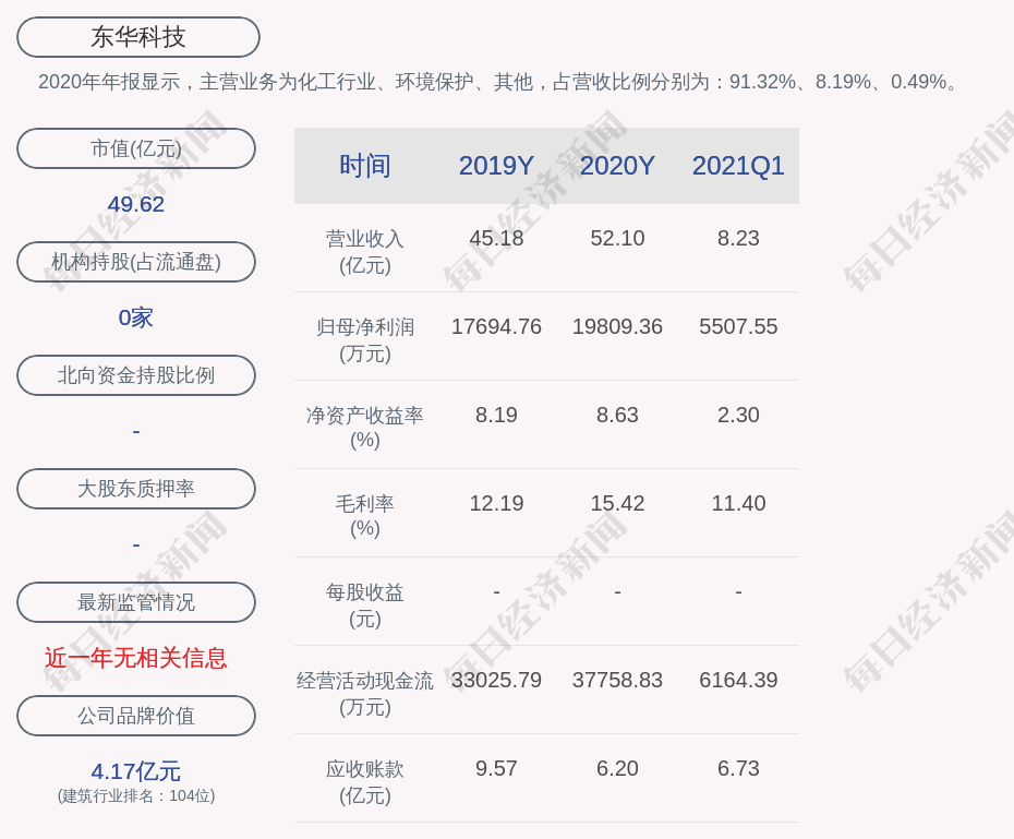 2020年年报显示,东华科技的主营业务为化工行业、环境保护、其他,占营收比例分别为:91.32%、8.19%、0.49%。