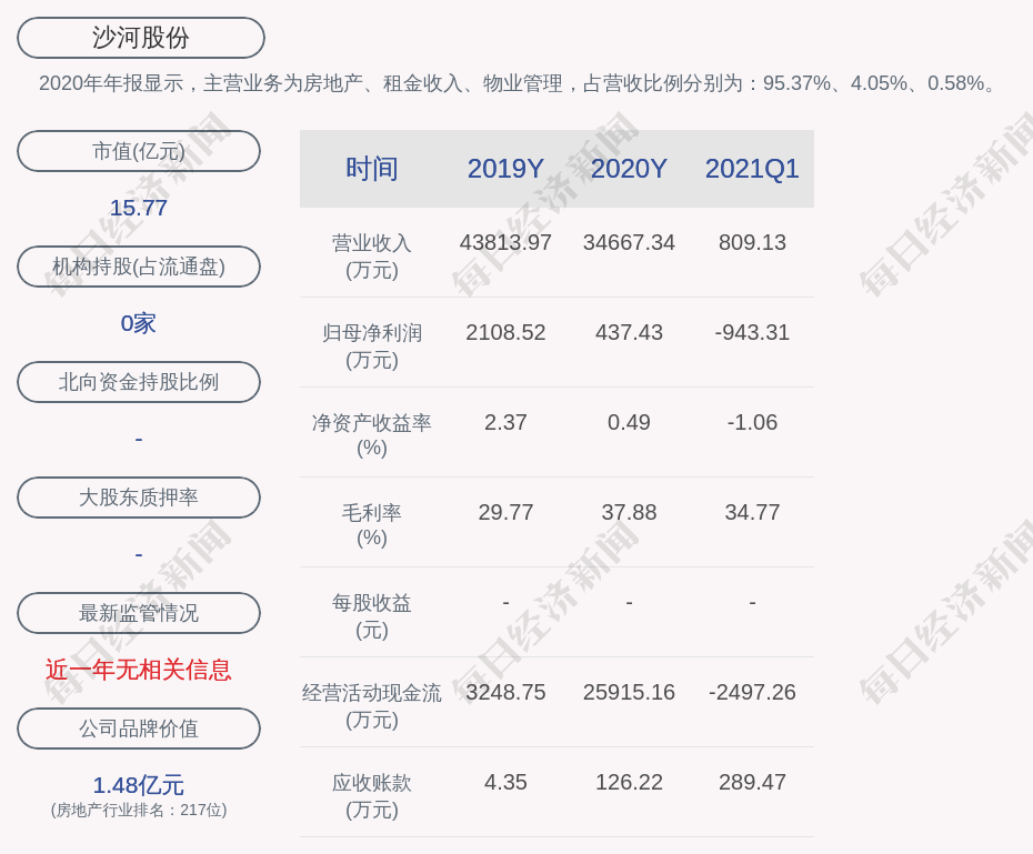 2020年年报显示,沙河股份的主营业务为房地产、租金收入、物业管理,占营收比例分别为:95.37%、4.05%、0.58%。