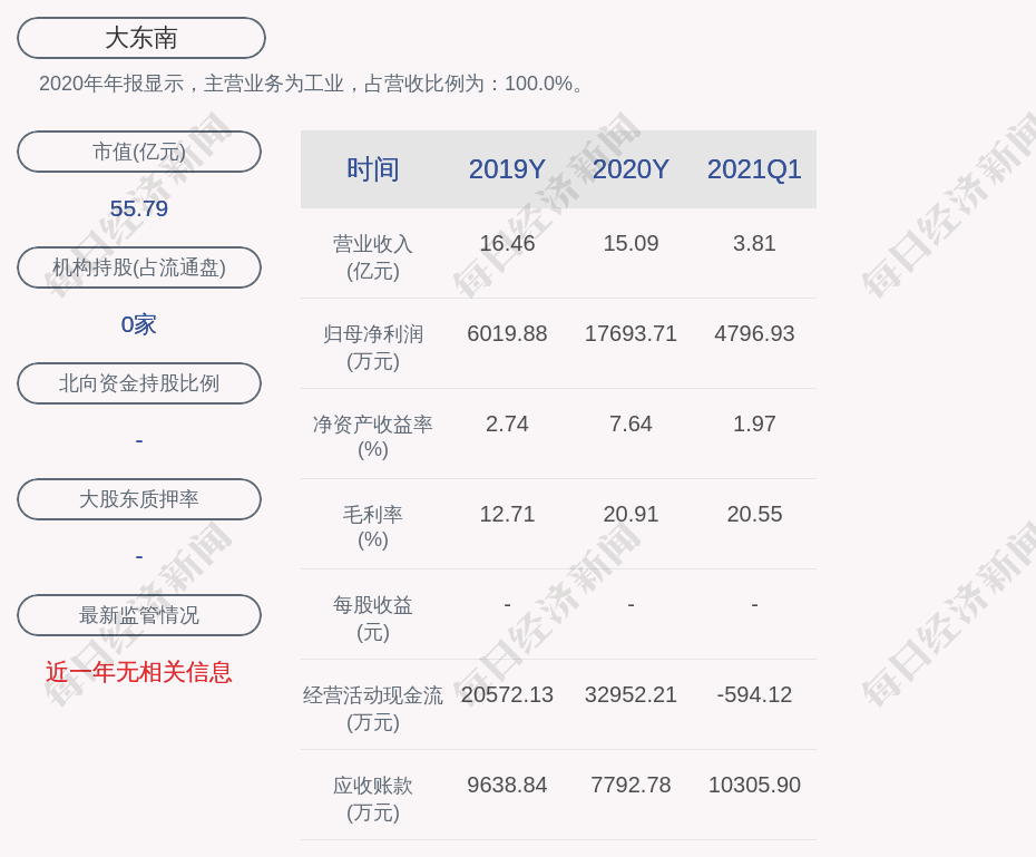 2020年年报显示,大东南的主营业务为工业,占营收比例为:100.0%。